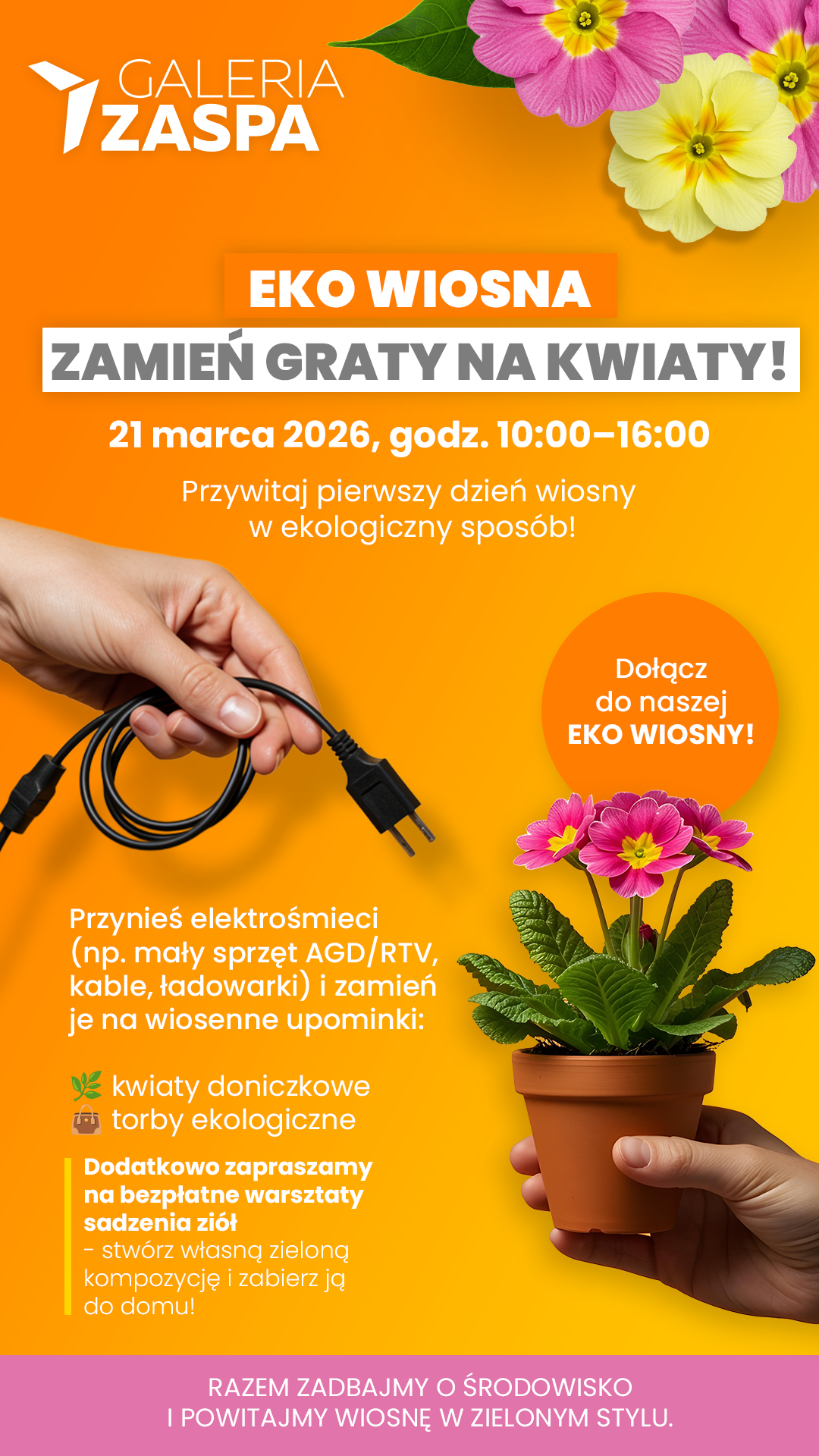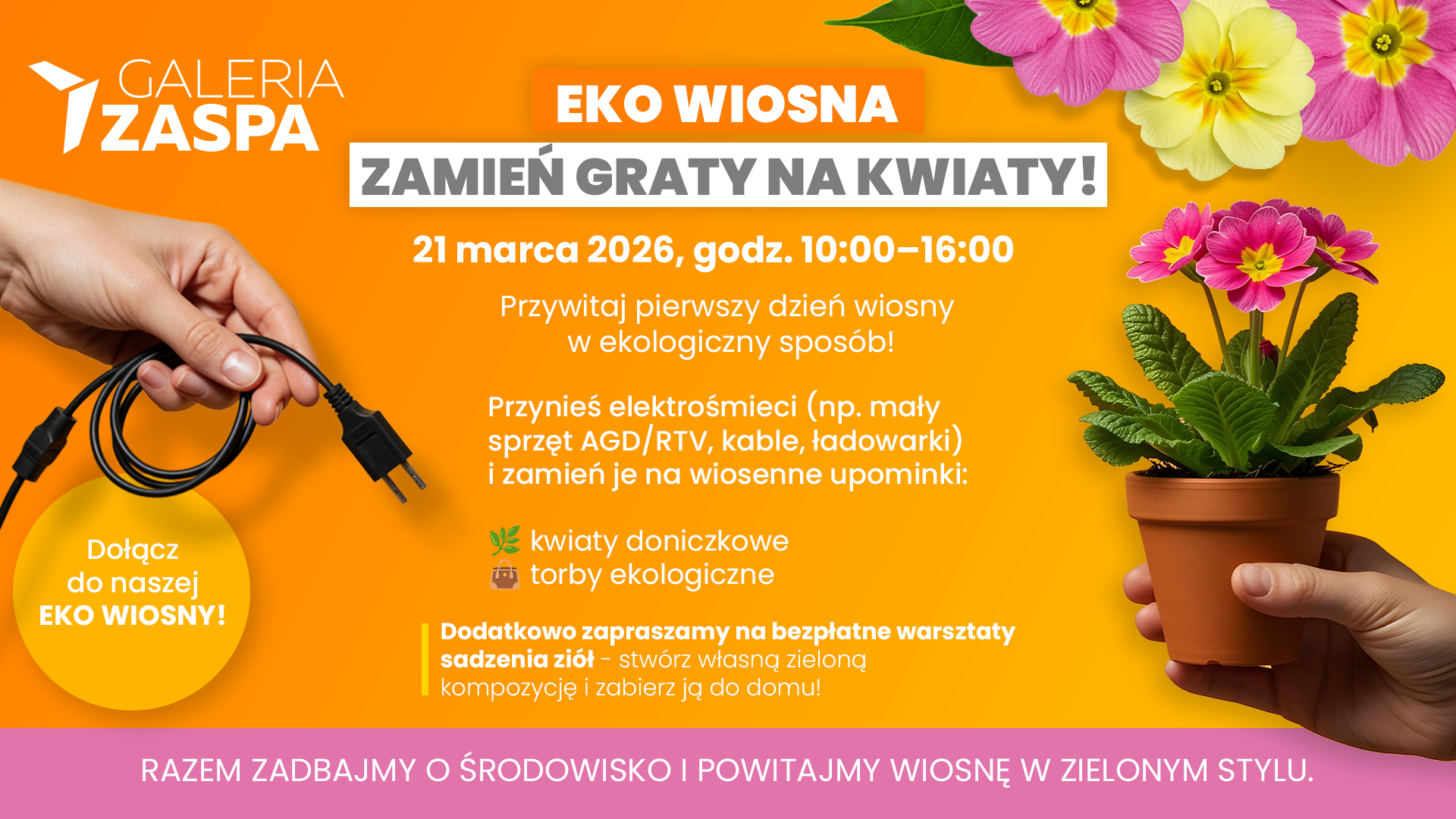 21 marca Galeria Zaspa zaprasza mieszkańców Gdańska na wyjątkowe wydarzenie z okazji pierwszego dnia wiosny. W ramach akcji „Eko-Wiosna: Zamień graty na kwiaty!” klienci będą mogli oddać elektrośmieci, wziąć udział w ekologicznych warsztatach i przywitać nową porę roku w zielonym stylu.
