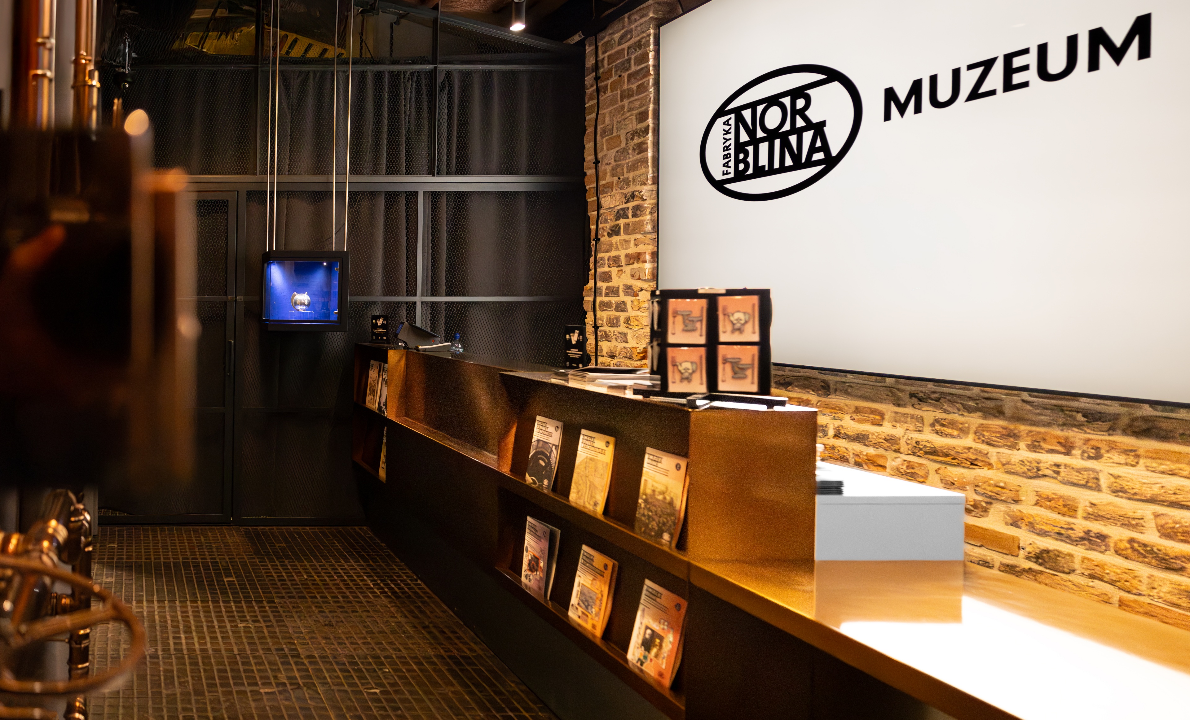 Konstrukcja lady zapewnia dostępność dla osób z niepełnosprawnościami, umożliwia sprawną obsługę zwiedzających, wydawanie audioprzewodników oraz jednoczesną pracę dwóch osób. Całość funkcjonuje jak współczesny „konsolowy interfejs” muzeum. Tłem dla nowego projektu są oryginalne ceglane ściany, stare lampy oraz podłogowe płyty żeliwne, które zostały zachowane z czasów funkcjonowania fabryki i starannie odrestaurowane. We wnętrzach punktu informacyjnego ważnym elementem jest także mini-fotoplastykon, pełniący rolę wizualnego wprowadzenia do opowieści o historii Fabryki Norblina i zapowiadający dalsze etapy zwiedzania muzeum.