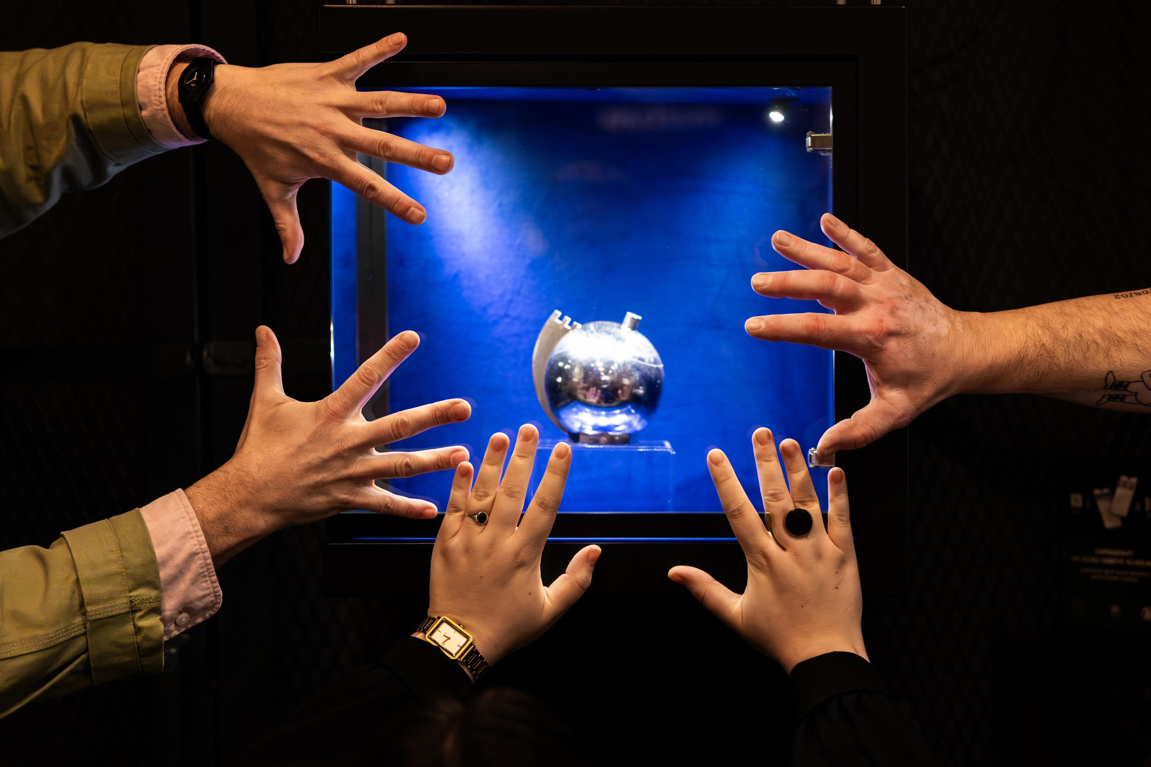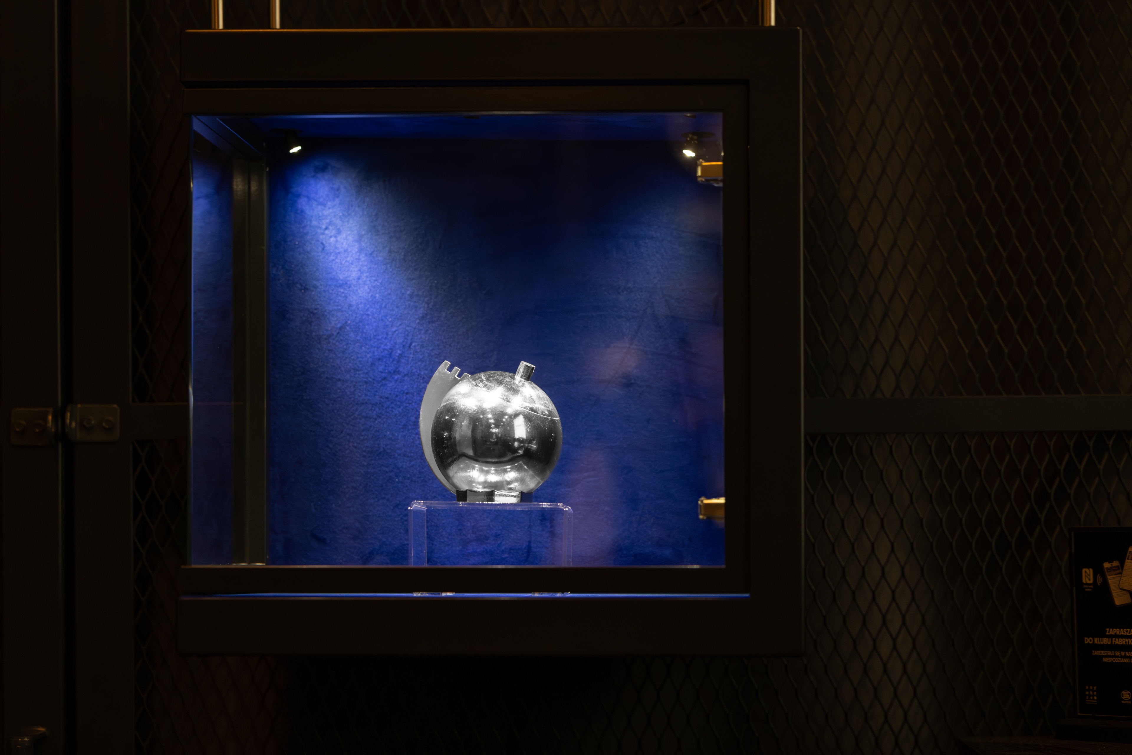 Centralnym elementem projektu jest gablota ekspozycyjna prezentująca reprodukcję cukiernicy-kuli projektu Julii Keilowej – najcenniejszego obiektu w ofercie muzealnego sklepiku. Lekka, niemal jubilerska forma gabloty została zaprojektowana jako integralna część aranżacji i podkreśla rangę przedmiotu, który do dziś uznawany jest za ikonę polskiego art déco. Oryginał cukiernicy powstał około 1935 roku na zamówienie zakładów Norblin, Bracia Buch i T. Werner. Muzeum Fabryki Norblina zrealizowało jej limitowaną, wierną oryginałowi serię, wykorzystując historyczne technologie oraz analogowe techniki metaloplastyczne. Za rekonstrukcję odpowiadał Tomasz Gil, który odtworzył proces formowania, konstrukcji i srebrzenia – prace nad projektem trwały ponad dwa lata. Uzupełnieniem tej ekspozycji są proste, eleganckie półki prezentujące pozostałe produkty muzealnego sklepiku – pamiątkowe drobiazgi inspirowane historią Fabryki Norblina. Całość wpisuje się w minimalistyczny charakter projektu, łącząc funkcję sprzedażową z narracją muzealną i estetyką miejsca.