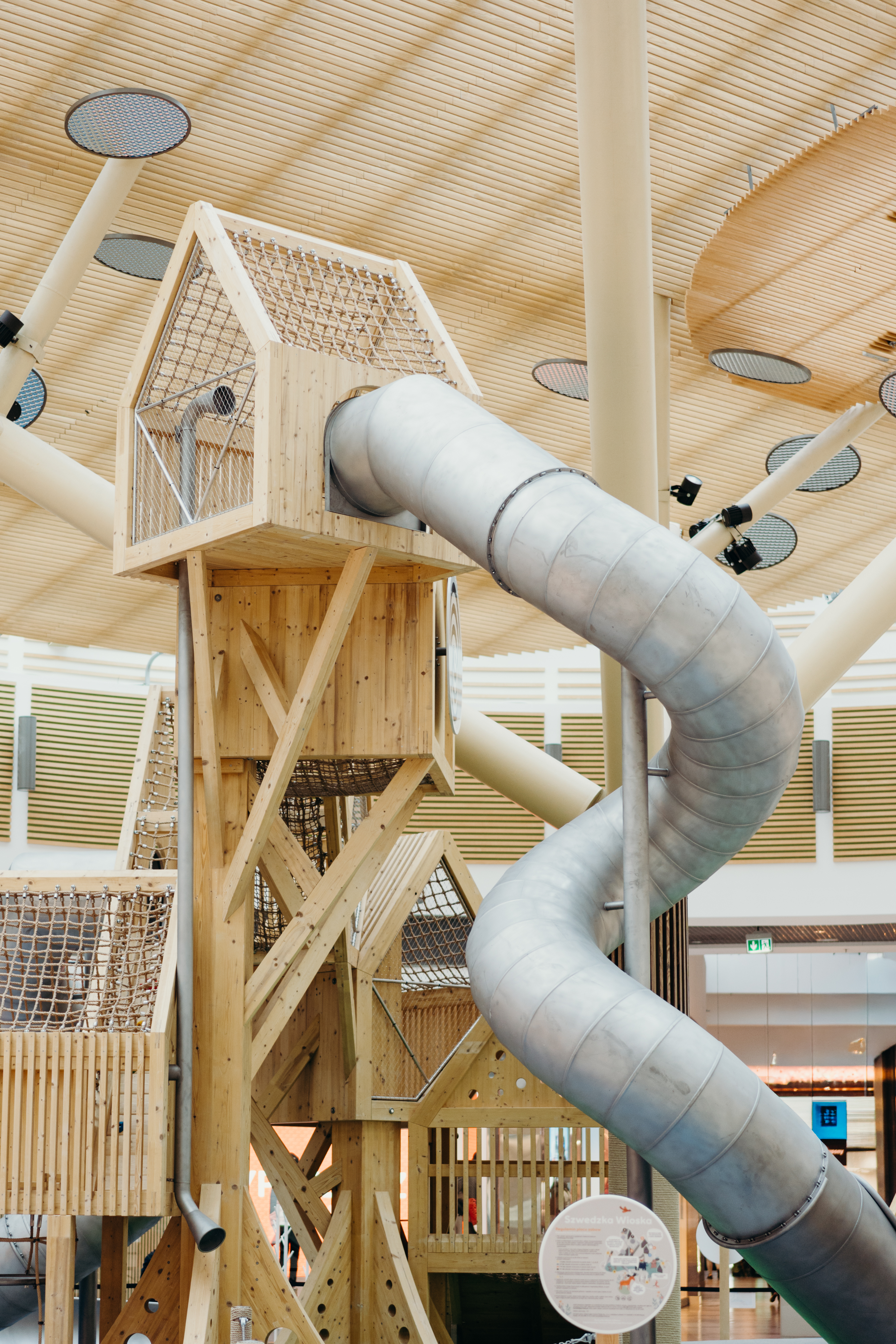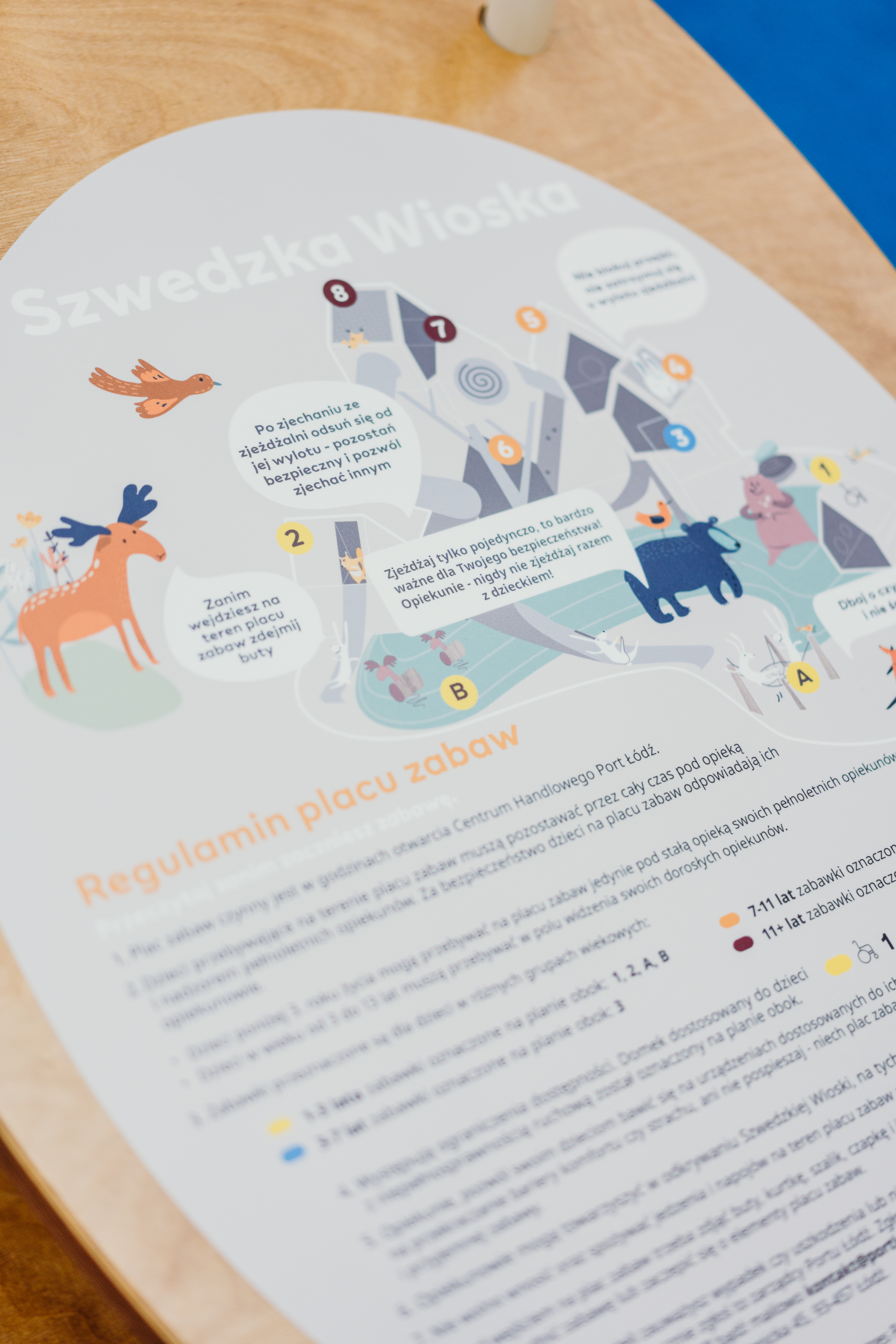 W skład Szwedzkiej Wioski wchodzi osiem drewnianych domków połączonych mostami i przejściami, trzy zjeżdżalnie – w tym największa o długości 6,14 metra, bocianie gniazdo, dwa bujaki-renifery, a także liczne tunele, siatki, pochylnie i „kryjówki”. To przestrzeń, która zachęca dzieci do eksplorowania, wspinania się, współpracy i samodzielnego odkrywania świata – w bezpiecznych, kontrolowanych warunkach.