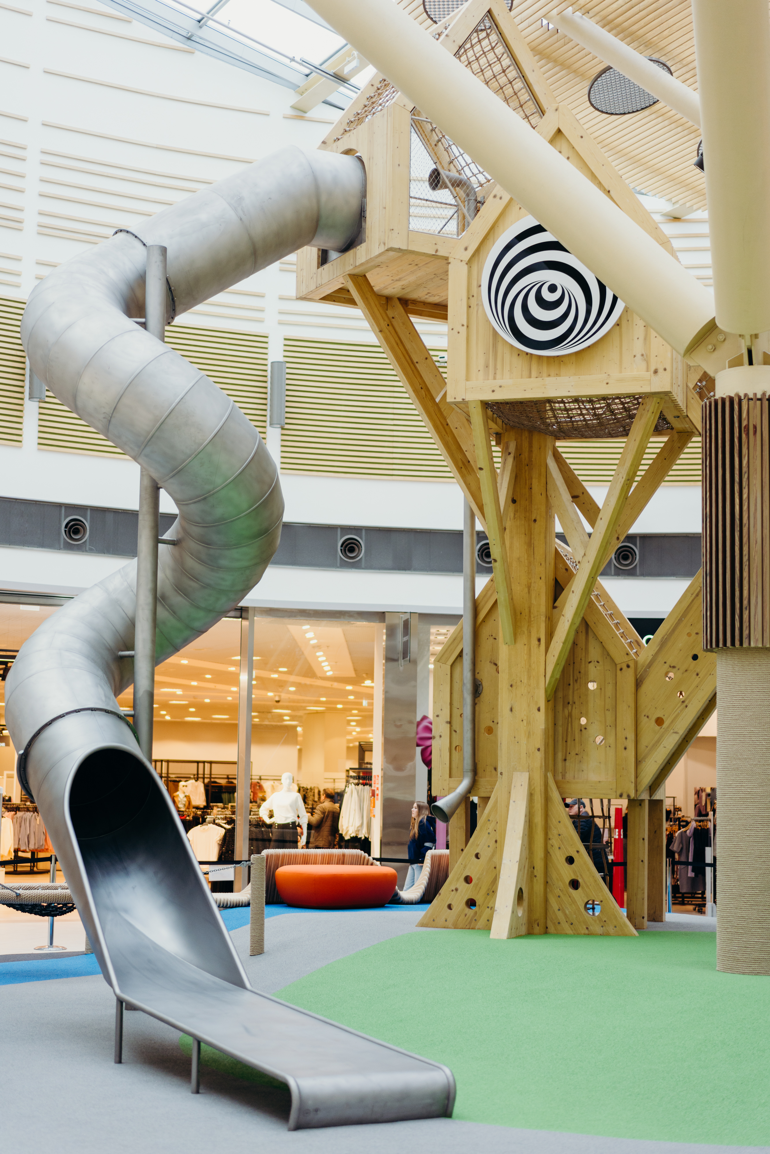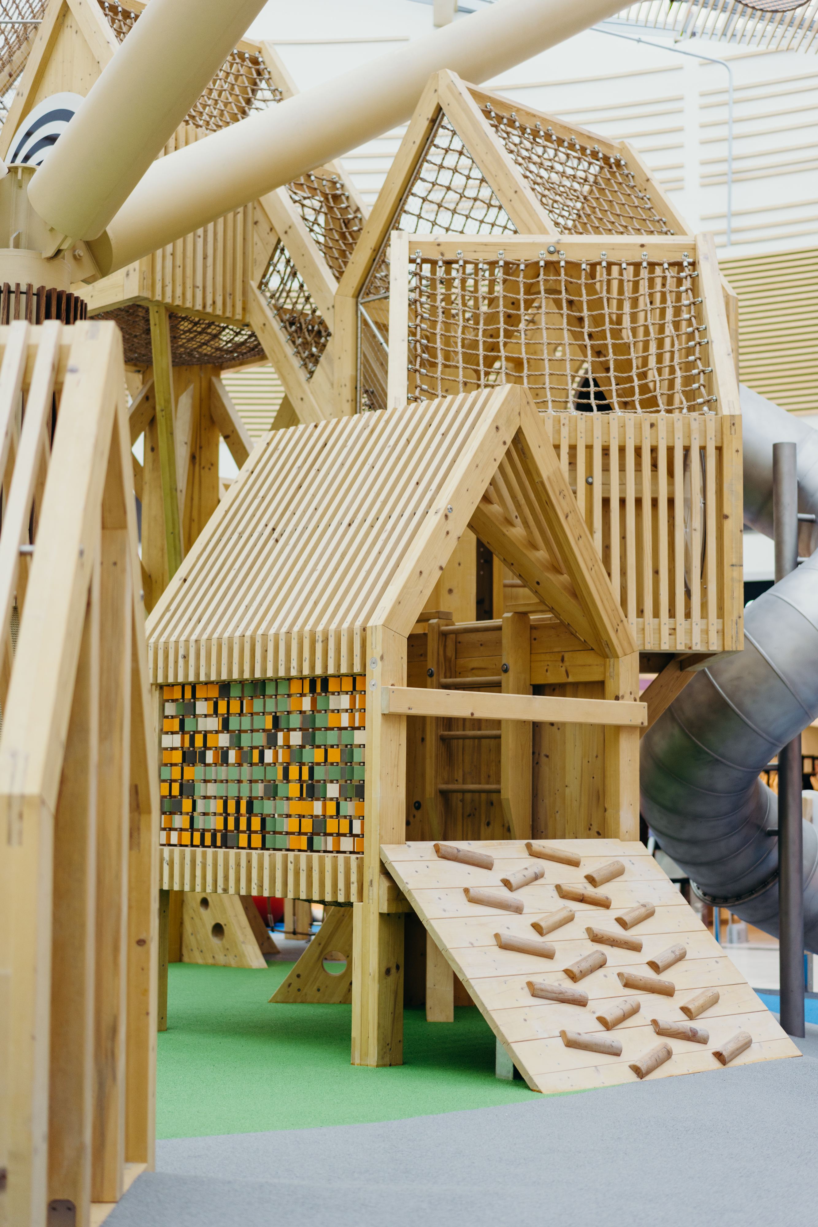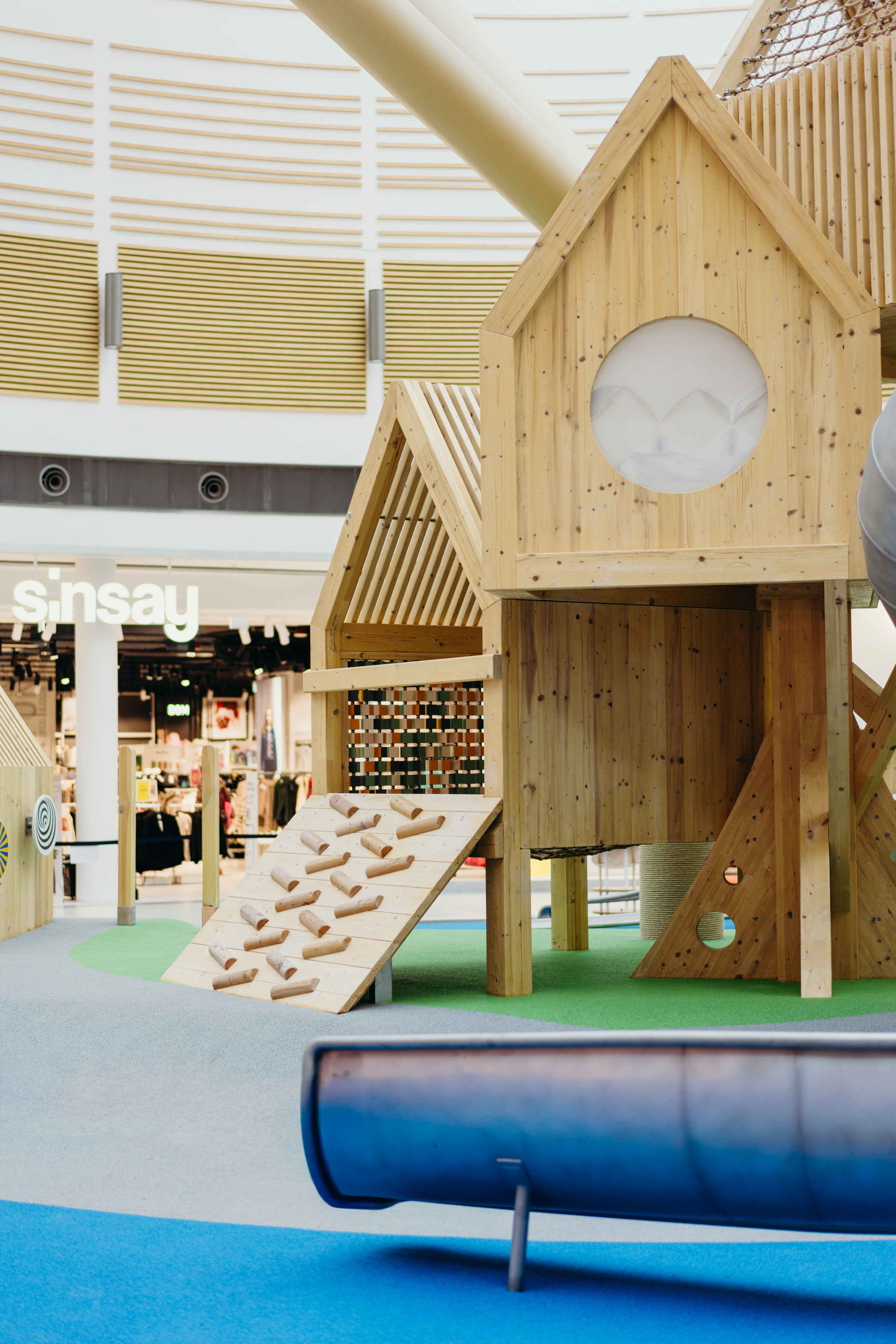 Nowa atrakcja w centrum handlowym przy Pabianickiej w Łodzi zajmuje powierzchnię 235 m², a jej najwyższy punkt sięga ponad 9 metrów, tworząc wielopoziomową przestrzeń pełną wyzwań, ruchu i przygody. Konstrukcja została solidnie zakotwiczona w budynku i wykonana głównie z drewna i lin, zgodnie ze skandynawską filozofią naturalnej zabawy.