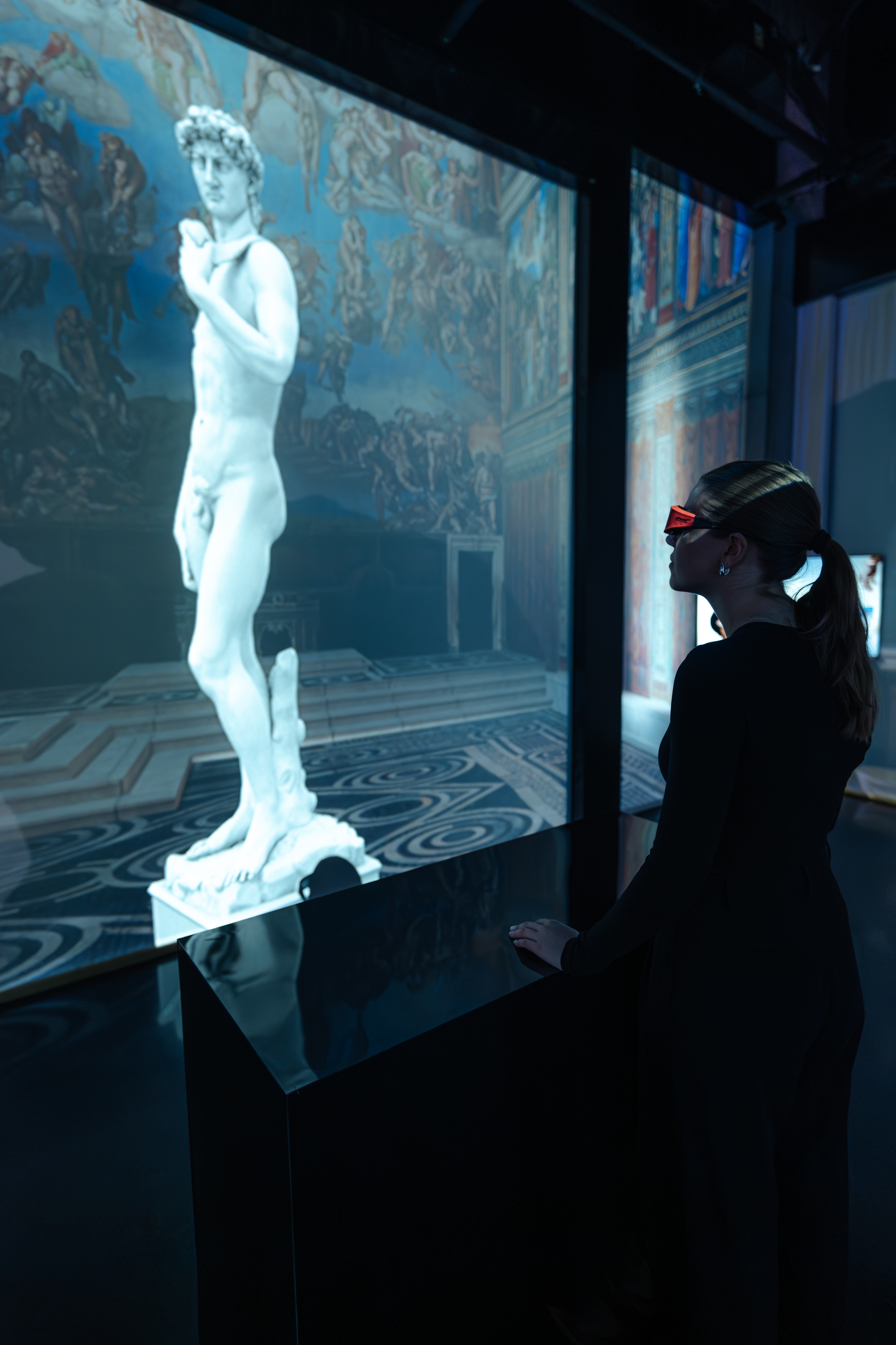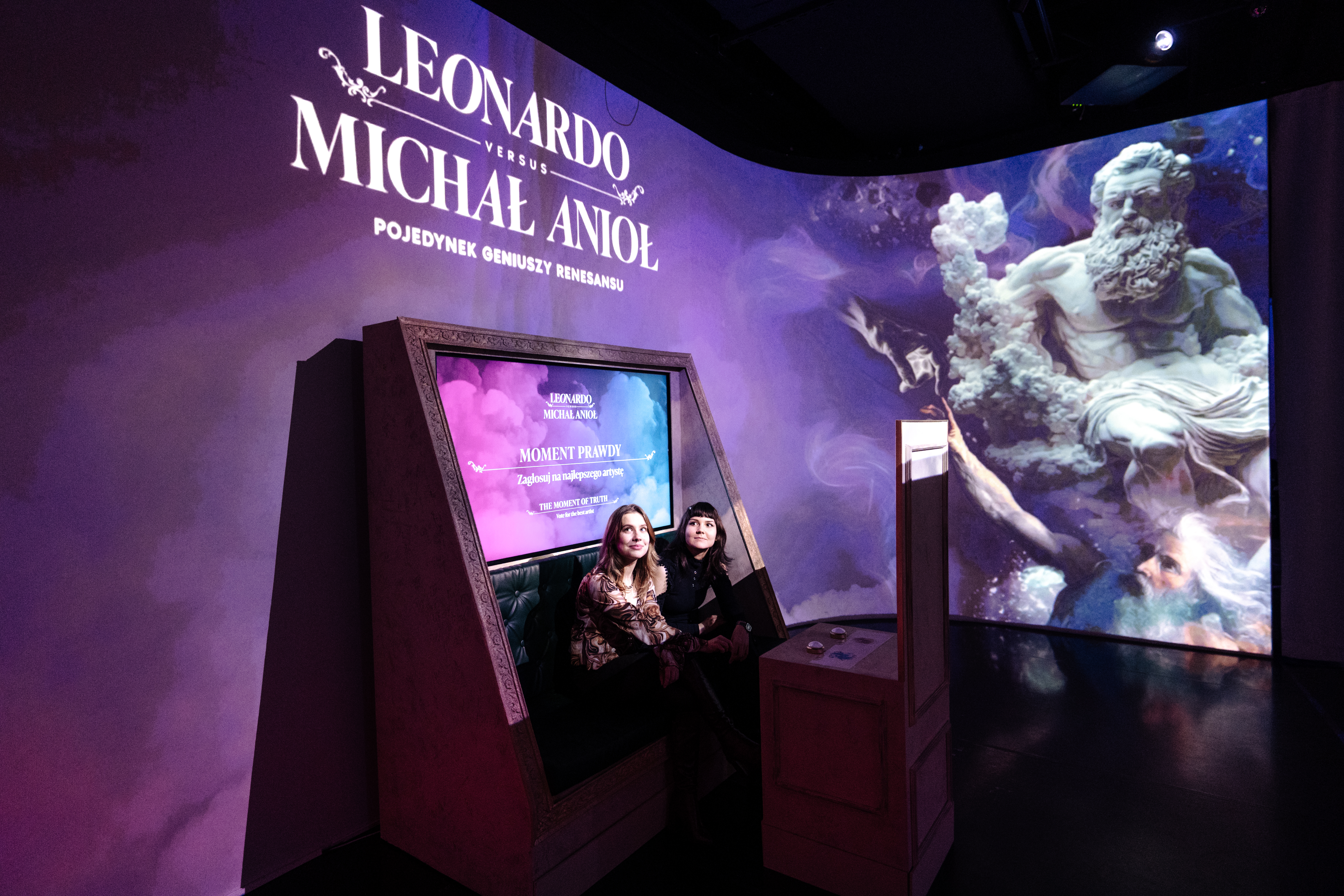 Centralnym punktem ekspozycji jest sala immersyjna, w której obraz, dźwięk i ruch tworzą wielozmysłowe doświadczenie, pozwalające dosłownie znaleźć się w samym środku artystycznego pojedynku. Kolejna przestrzeń oferuje doświadczenie VR 360°, przenoszące widzów do XVI-wiecznej Florencji i pracowni mistrzów.